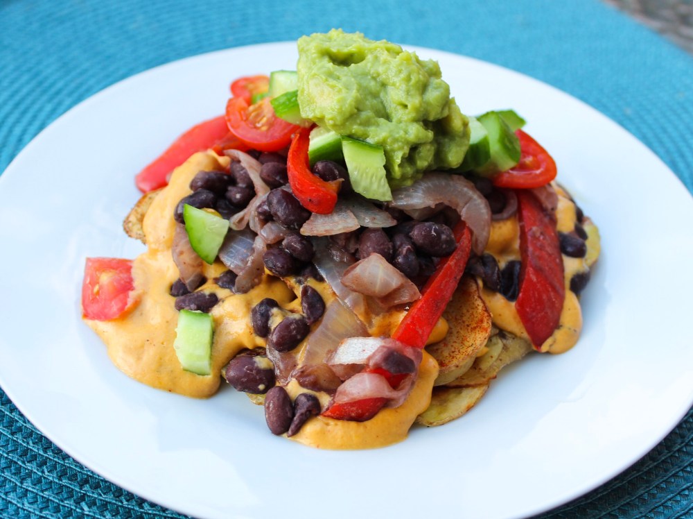 Loaded Potato Bean NachosIf you’ve never used thinly sliced, crispy potatoes as a base for nachos, do yourself a favor and try it out ASAP! This was so tasty! Potatoes were a great replacement for chips because they’re the same shape and can hold the toppings without the oil, but still have the crispiness. I sprinkled them with chili powder, onion powder, garlic powder, salt and pepper before baking which packed them with more flavor than a chip.