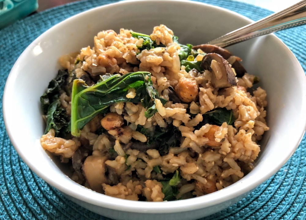 6. When rice cooker is done, add chickpeas and kale to rice mixture and serve.