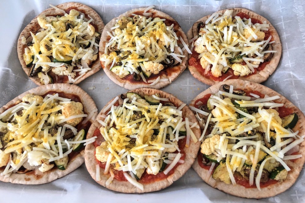 3. Add a handful of the veggie mixture to each pizza and spread then add a little of the potato shreds to mimic cheese texture on top.