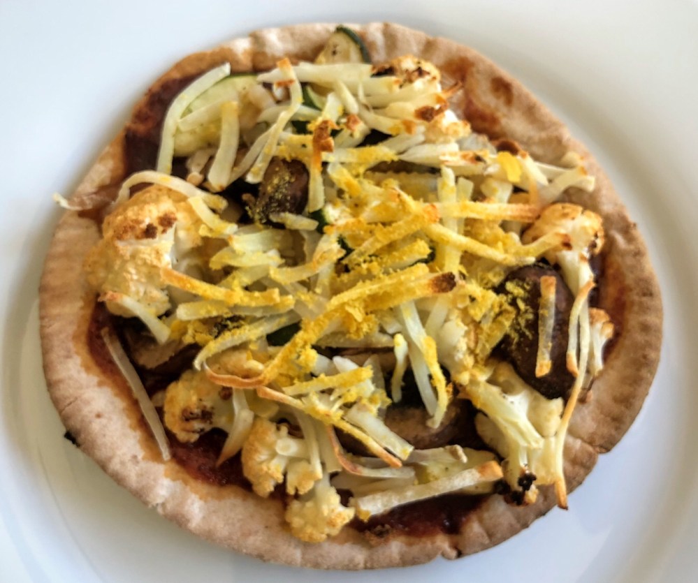 Mozzarella or potato shreds? Well it looks like cheese shreds, but it’s potato which mimics the same look and texture to top the pizza. These personal BBQ pizzas were scrumptious! I roasted onions, cauliflower, zucchini, and mushrooms and used them to top a whole wheat pizza with sweet and spicy BBQ sauce. I added a sprinkle of shredded potato and a dash of nutritional yeast and popped them back in the oven to get crispy. I also made some extra pizzas with marinara for lunch the next day to switch it up and be prepared. I found a recipe for these on Pinterest, but they made their own sauce and pizza dough which I didn’t want to do. The Organic Brown Sugar BBQ sauce from TJ’s is so tasty and I like to use whole wheat pitas for pizzas because they’re a great size with no oil. You can use whatever vegetables you want to use to top these pizzas, but this combination was delicious!