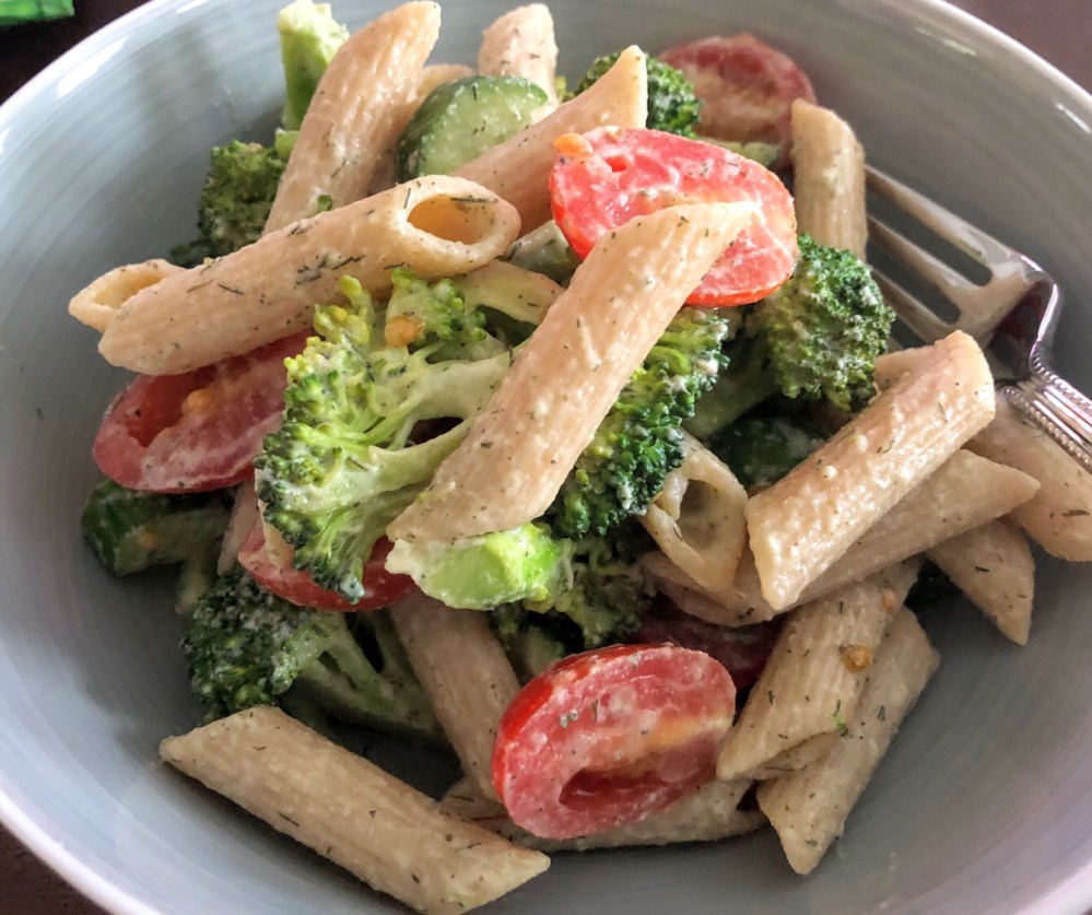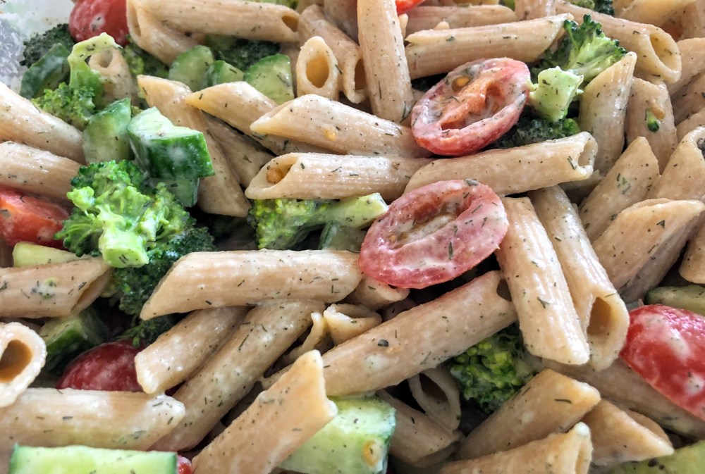 Need a simple and fresh pasta salad for summer? This was a tasty and dill-icious light dinner and would be perfect as a side for a cook out or party. It’s only a few ingredients and it comes together quickly, so I’m glad I put these things together because it definitely works! I used High Carb Hannah’s oil free tzatziki sauce as the dressing and used whole wheat Penne, cucumber, tomatoes, and blanched broccoli with some extra dill and you can add onion, chickpeas, asparagus, olives, or whatever veggies you’d like. I served it cold, but it could also be served warm if you prefer.