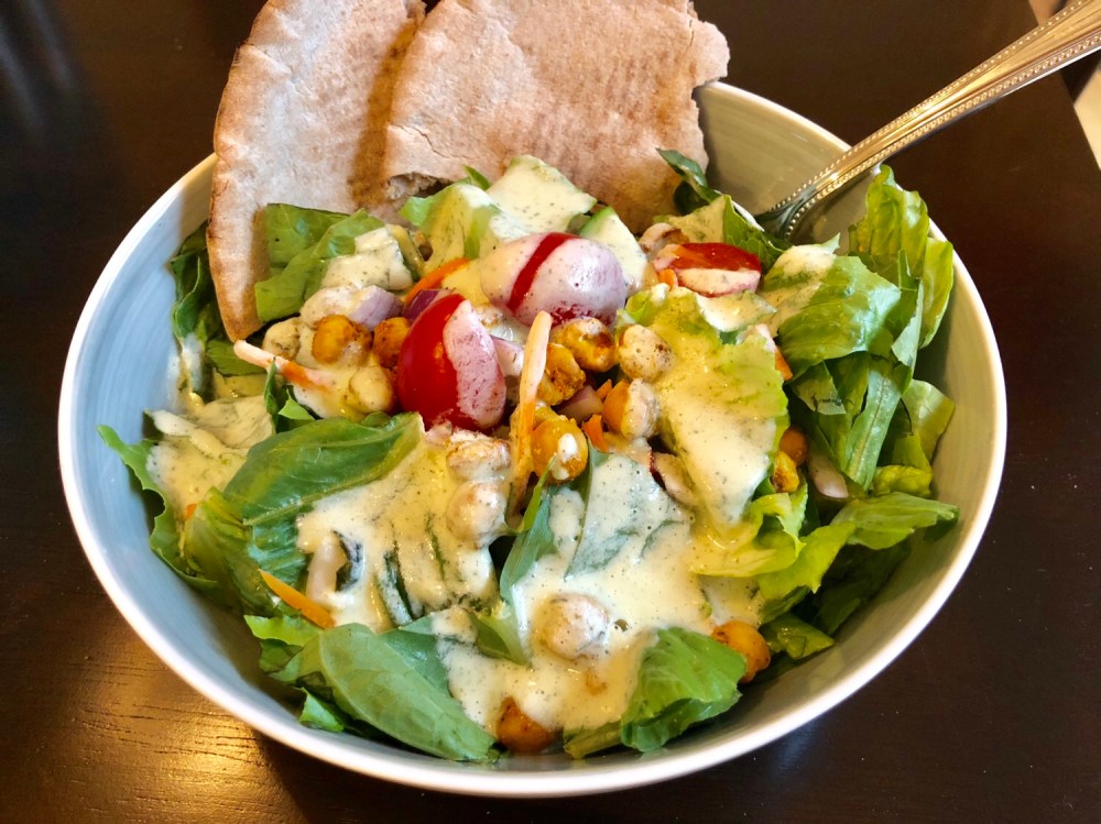 5. Add crunchy chickpeas to salad and then top with dressing.