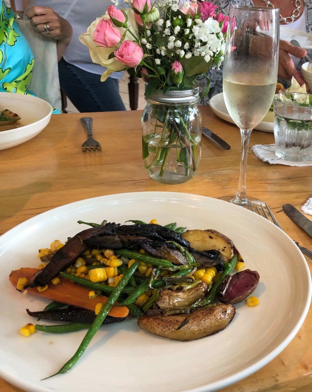 Yesterday at the shower, we threw it at Bistro VG in Roswell and they knew ahead I was vegan and prepared a great vegan meal for me. They brought out a simple lettuce, beet, shaved potato salad to start and made a sautéed mix up of fingerling potatoes, green beens, corn, and portobellos. I also had a side of grilled bread. Josh and I went out for dinner to a newish sushi place called Monkey 68, and I didn’t see many vegan choices on the menu. We ordered edamame to start, and I asked if they could just make a mixed vegetable roll and it was really tasty! They even apologized at the end saying they don’t have many options now, but they will hopefully have more in the future.