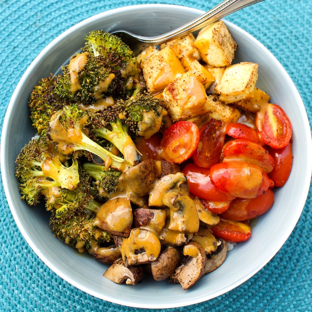 8. Add rice to a bowl and top with tofu, broccoli, tomatoes, and mushrooms and drizzle with dressing.