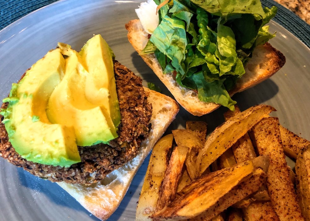 For Labor Day, I wanted to make some simple black bean burgers without a million ingredients and use what I had on hand. I mixed some oats, black beans, veggies, and spices to make a Mexican-ish tasting burger with a nice firm texture and topped them with avocado, lettuce, and a chili spiced ketchup and mustard. I also paired it with some chili spiced crispy oven baked fries. If you have a food processor, it’s easier to make veggie/bean burgers but these can be made without one. My brother asks for easy bean burger recipes but they usually involve a lot of ingredients in a food processor so this can be done by hand. You would either have to buy oat flour or maybe they could be blended in a high speed blender? Never tried. You would just need to chop the onions/peppers finely and mash the beans with fork and the rest is just mixing! Hooray! You could also add corn to these, but I prefer without.