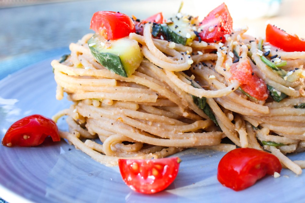 Who knew you could make hummus into a creamy, garlicky, lemony sauce for pasta?! I mean, sign me up. I like hummus, I like pasta, and combined was a tasty mix. I used zucchini, spinach, and tomatoes as the veggies inside and the hummus as my sauce base. I added some pasta water to thin the hummus out into a sauce and added in the spaghetti noodles. I added some fresh tomatoes on top for freshness and sprinkled Everything but the Bagel seasoning on top because that’s how I usually top my hummus. It’s a simple and easy dinner, but something different to mix things up.