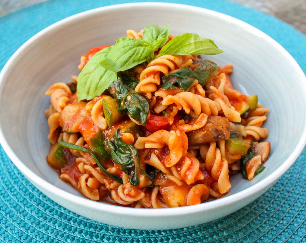 I bought a bag of whole wheat fusilli from Trader Joe’s to bring to the mountains as a back up in case we needed something to eat, but since we didn’t I got to use it the night we got home. I got some more veggies because I like to have about an equal ratio of veggies to pasta and a jar of oil free marinara and call it a day. It’s such a simple dinner and it’s low fat and follows the starch solution guidelines. It’s cheap and makes a ton! Also you can whip it up in about 10 minutes or as long as the pasta takes to boil. This is a great last minute meal and I love having the leftovers for lunches. You can add whatever veggies you have on hand, these are just the ones I like in my pasta.
