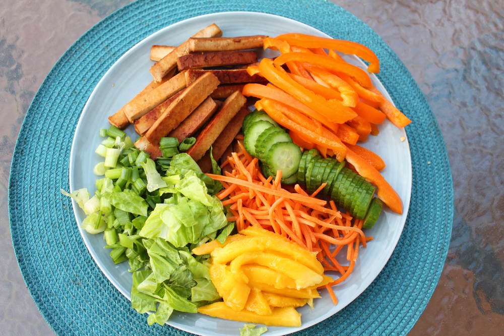 - I did a few slices of each veggie, one piece of tofu, small handful of noodles, and then bring the bottom half of the wrapper over the fillings, and then bring the sides over the bottom, and then roll it up.