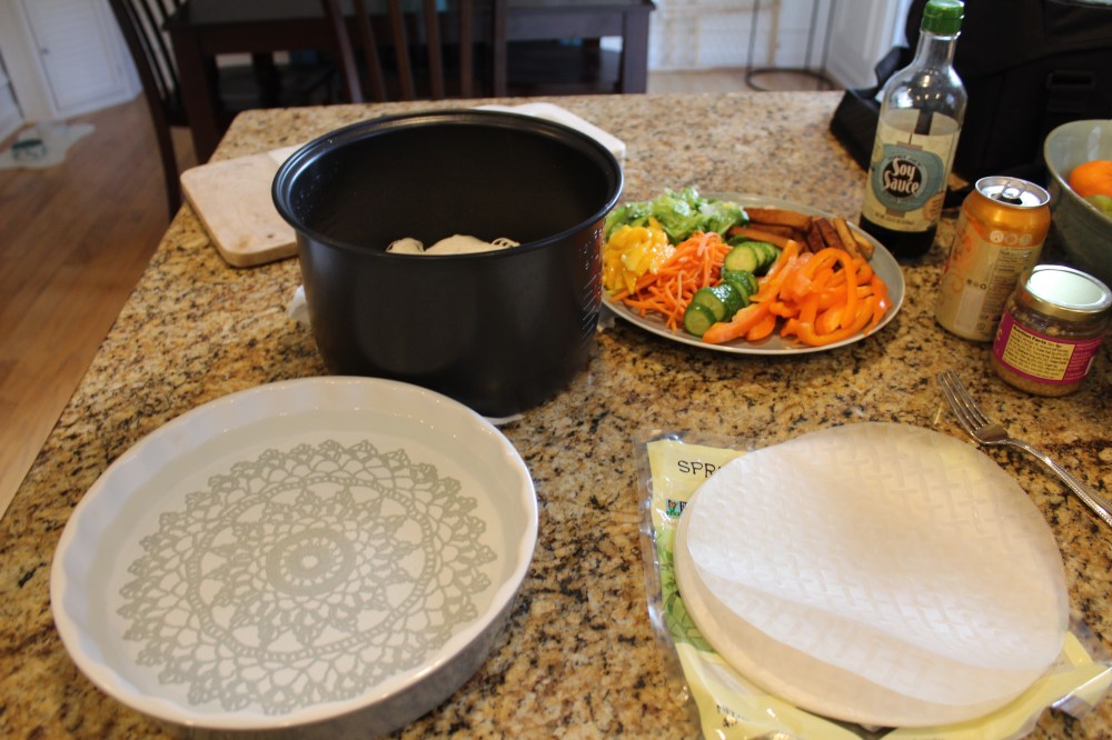 I’ve always been intrigued with summer rolls… are they called spring or summer rolls? They look so fresh and delicate, but they look like a wrapped up present of goodness with a stain glass window to see what’s inside. I saw the rice paper wrappers at the store last week and decided it was time to give them a try before it got chilly outside. I grabbed some of my favorite veggies, some vermicelli noodles, and baked teriyaki tofu. I researched and looked up recipes on how to wrap the rolls and it’s pretty much how you would wrap a burrito. I made a quick peanut soy sauce to dip them in and they were exactly what I hoped for! I made mine like this…
