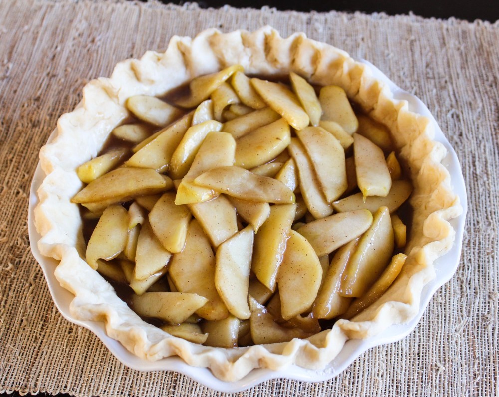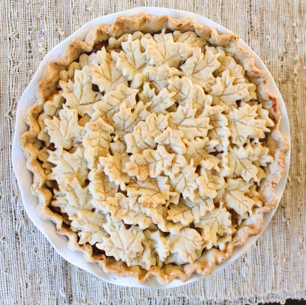 I used this easy vegan pie crust recipe (https://www.noracooks.com/vegan-pie-crust/) and doubled it for the top and bottom crusts. It was SO easy to make and it comes together in your food processor. Plus no need to refrigerate or parbake so it’s quick. I split it in half and rolled it out easily, then added it to the bottom of my pie pan that I love from Williams Sonoma. I put it in the fridge while I rolled out the top, and used a couple leaf cookie cutters to cut out the pie crust for the top. I took the bottom out of the fridge, added the filling and decorated the top with the leaf pie crust cutouts. I sprinkled with raw sugar and baked on 350* for about 45-50 minutes which is longer than the directions said. I hope it’s as tasty as it looks!
