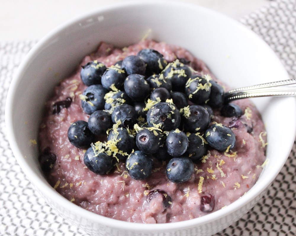 4. When it’s the consistency of your liking, scoop into a bowl and add more fresh blueberries and lemon zest on top.