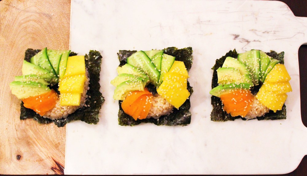 - Flip rice onto a platter and then you can use a spatula to move each one onto a quarter of the nori sheet.