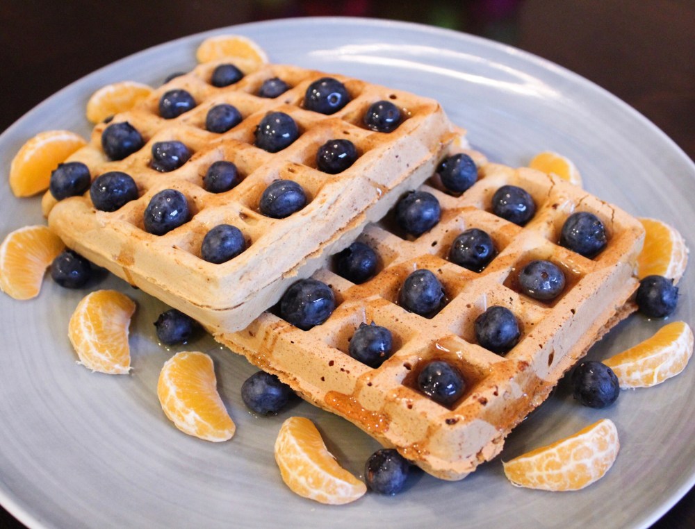 When I made my blueberry pancakes last weekend, I found my waffle maker sitting on top of my griddle so it made me want to use it. I’ve probably only used it a handful of times since we got it for our wedding, and I usually use it to make oil free hash browns. Since the pancake batter worked out so well last weekend, I tried to make something similar for waffles. I didn’t have spray oil so I couldn’t use it if I wanted to, so they’re oil free but but sure your waffle iron is nonstick. I probably cooked them longer than I should have because I was waiting for them to not stick to the iron to show me they were done, but they were extra crunchy. The outside was crispy but they were still tasty covered with fruit and maple syrup. They’re like pancakes with blueberry holders!