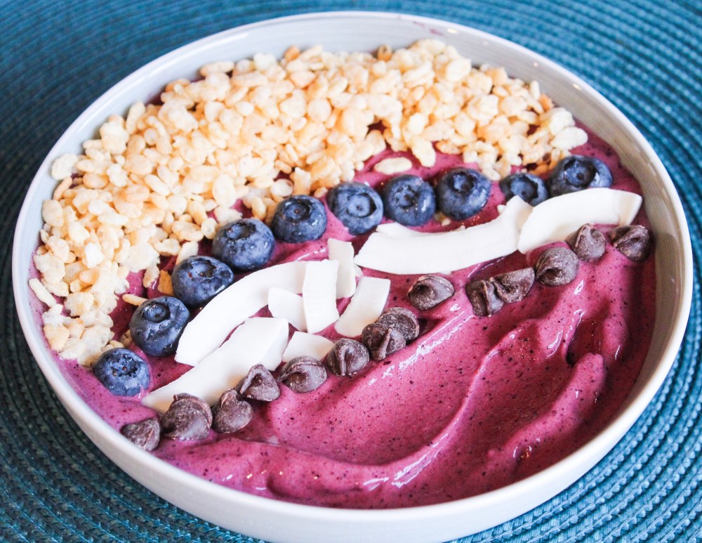 Blend in a high speed blender and I topped with rice crispies, blueberries, coconut chips, and dark chocolate chips. It’s a sweet breakfast that’s healthy, unlike so many sugary cereals and pastries that are not.