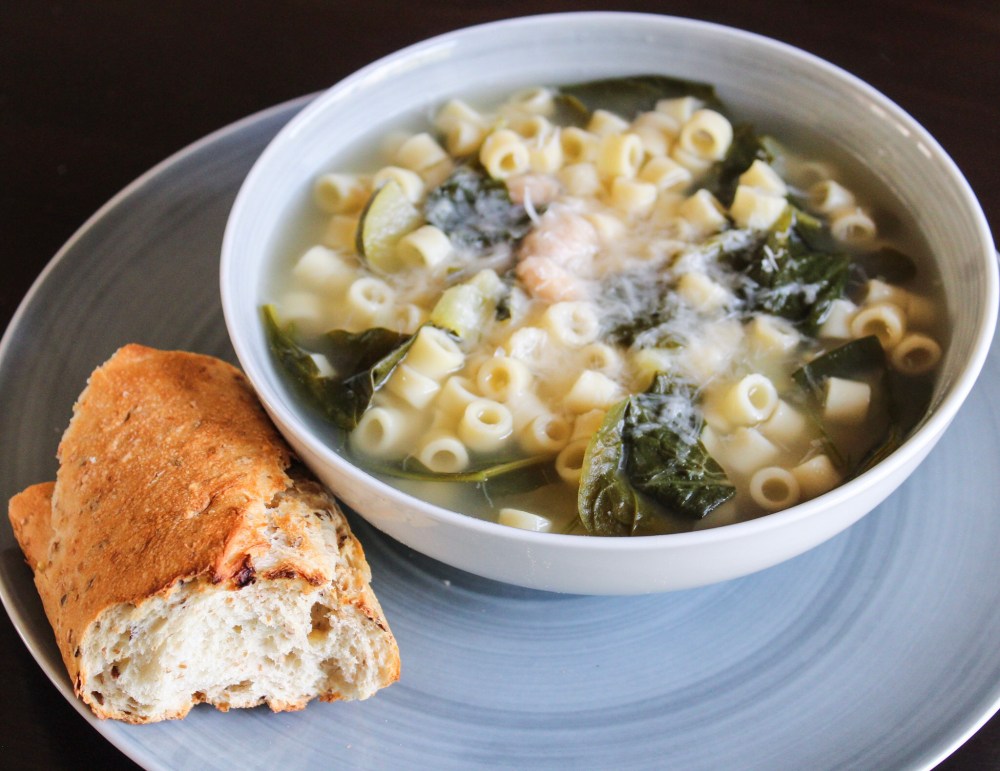 I’ve been meaning to make this white bean soup for a few weeks and then this weekend I got the stomach bug. Not pleasant. So all weekend I’ve been eating soup and crackers so why not continue the trend? I got a little more adventurous by adding in a few things that weren’t carbs. It was lemony and fresh and perfect for not feeling great. Plus it’s super simple, you literally just put water and a few things in a pot to make a delicious soup! It has beans, pasta, veggies, lemon, and topped with vegan parm with a side of toasted baguette.