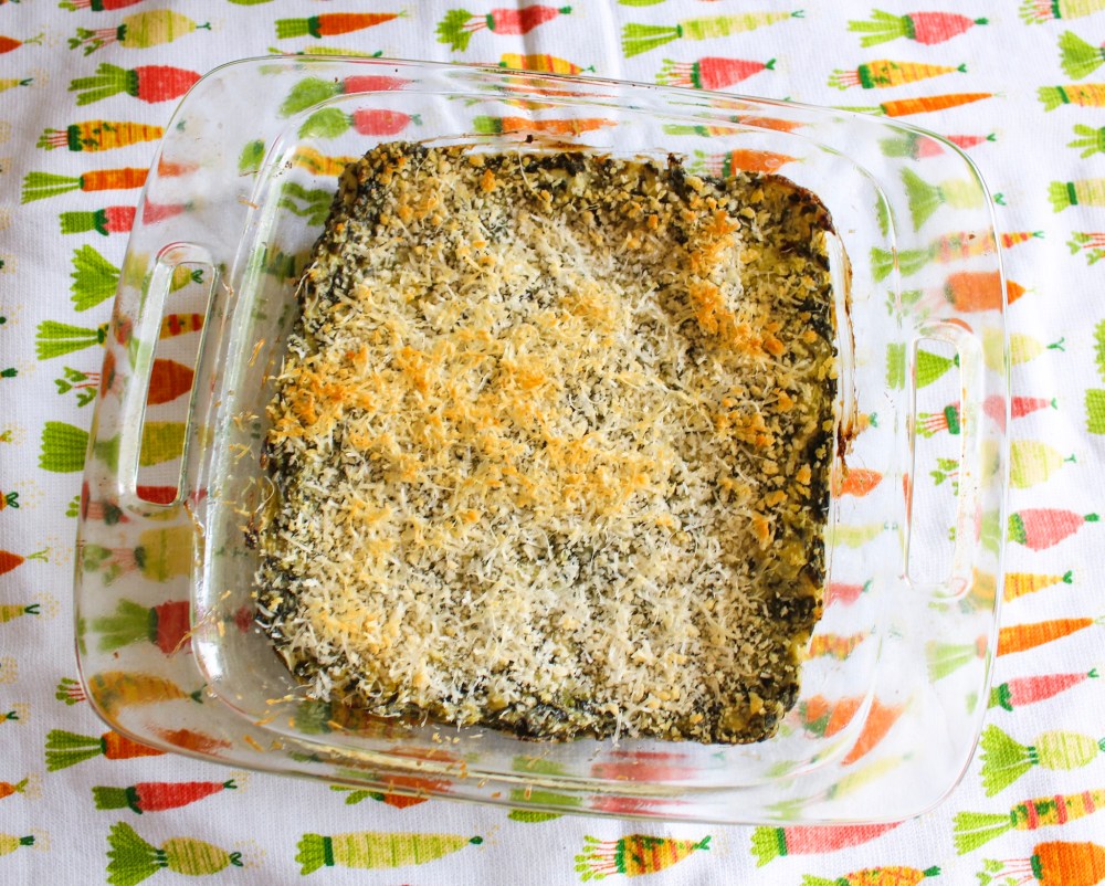 4. Add to a sprayed 8×8 baking dish, and add the dip. Top with panko and parm and bake uncovered for 25 minutes and then broil for 5 minutes until golden brown.