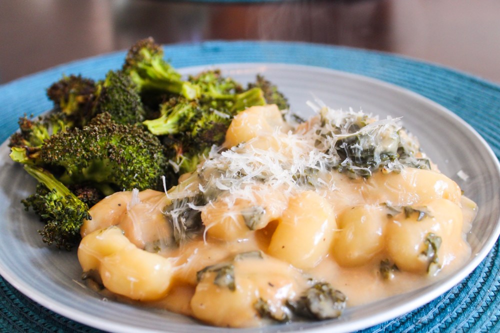 This tasty gnocchi is covered in a creamy Marsala type sauce with kale and baked in a casserole dish until bubbly, so what could be wrong? This was actually a mistake which turned out. I had my bestie test it and she’s the one who said it reminded her of a Marsala sauce, and she’s right! I was supposed to use Vegetarian no chicken base and only had no beef base so I used that instead. You use wine in the sauce so it took on a Marsala flavor which ended up to be good! I would definitely add mushrooms next time and it would be even better. I topped it with Violife vegan parm, because it’s one of my favorites and it’s so good. I served it with a side of roasted broccoli but it would be great with any veggies or salad.