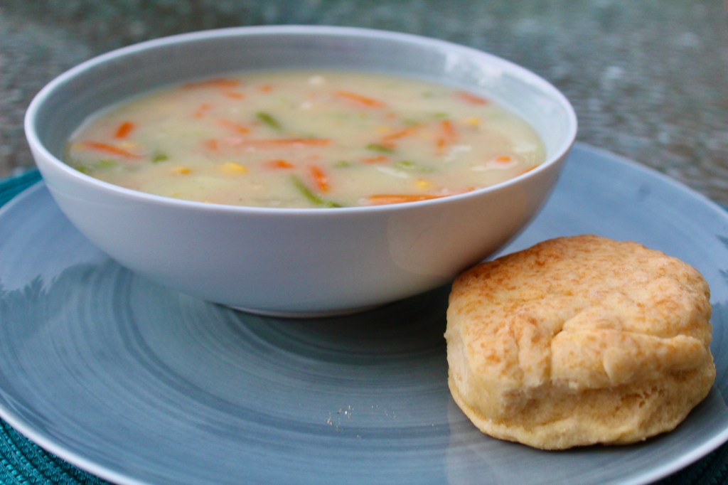 Anyone else need some comfort food right about now? While we wait for the election numbers, I’m having some leftover soup from last night and it’s a healthy version of comfort food. The old me would have just heated up a Marie Calendar’s frozen pot pie and called it a day, but those are terrible for you. It’s a lot easier to make than a whole chick’n pot pie and it’s tasty and warm when the air is getting crisp. Plus, these buttery vegan biscuits are the perfect dipper!