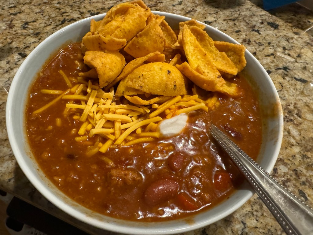 These freezing temperatures call for something warm and cozy and there’s nothing more warming than a big bowl of chili! This is based off my dad’s chili recipe, from his dad, and I’ve veganized it using Impossible meat. It’s a dump and simmer recipe so it’s easy to throw in the pot and go about your evening. You can vary the spice level by adding more chili powder, cayenne, or even a diced jalapeño but for my husband I keep it pretty mild! Hope this warms you up and you can enjoy with vegan sour cream, Violife cheddar shreds, and Frito scoops.